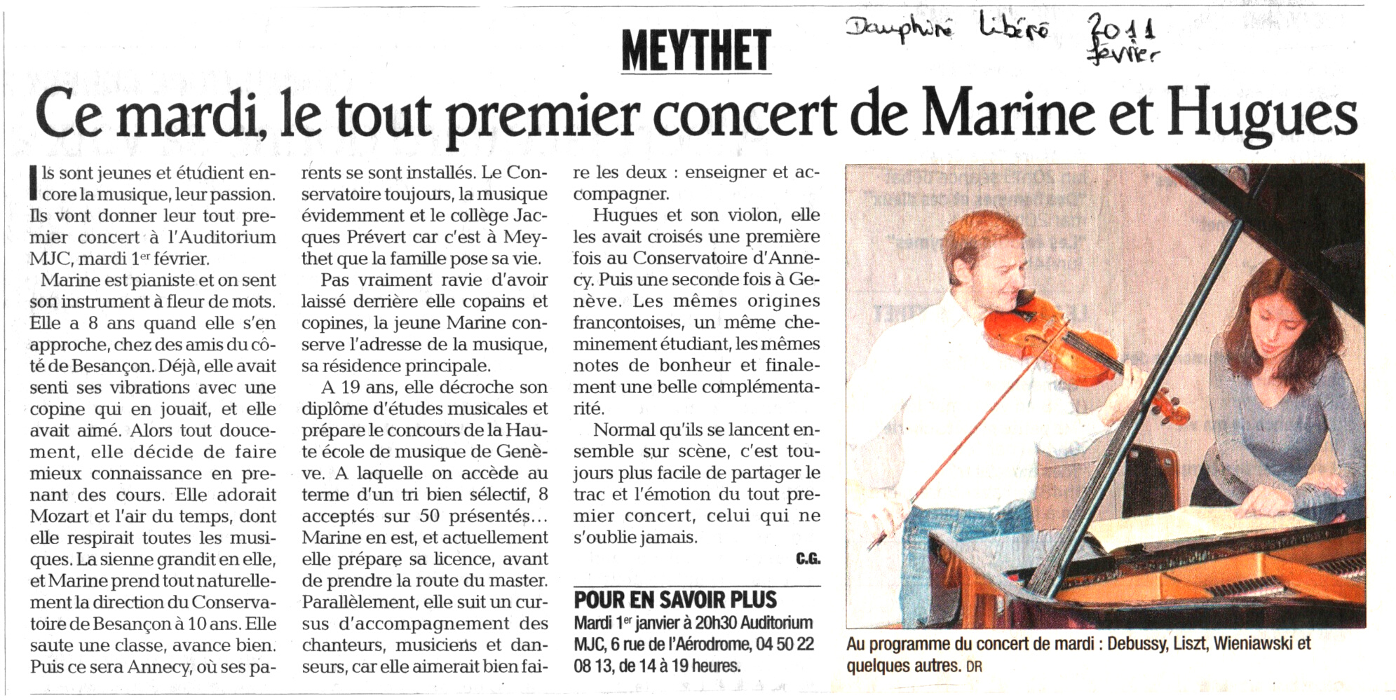 Article du "Dauphiné Libéré", février 2011 : "Ce mardi, le tout premier concert de Marine et Hugues"
