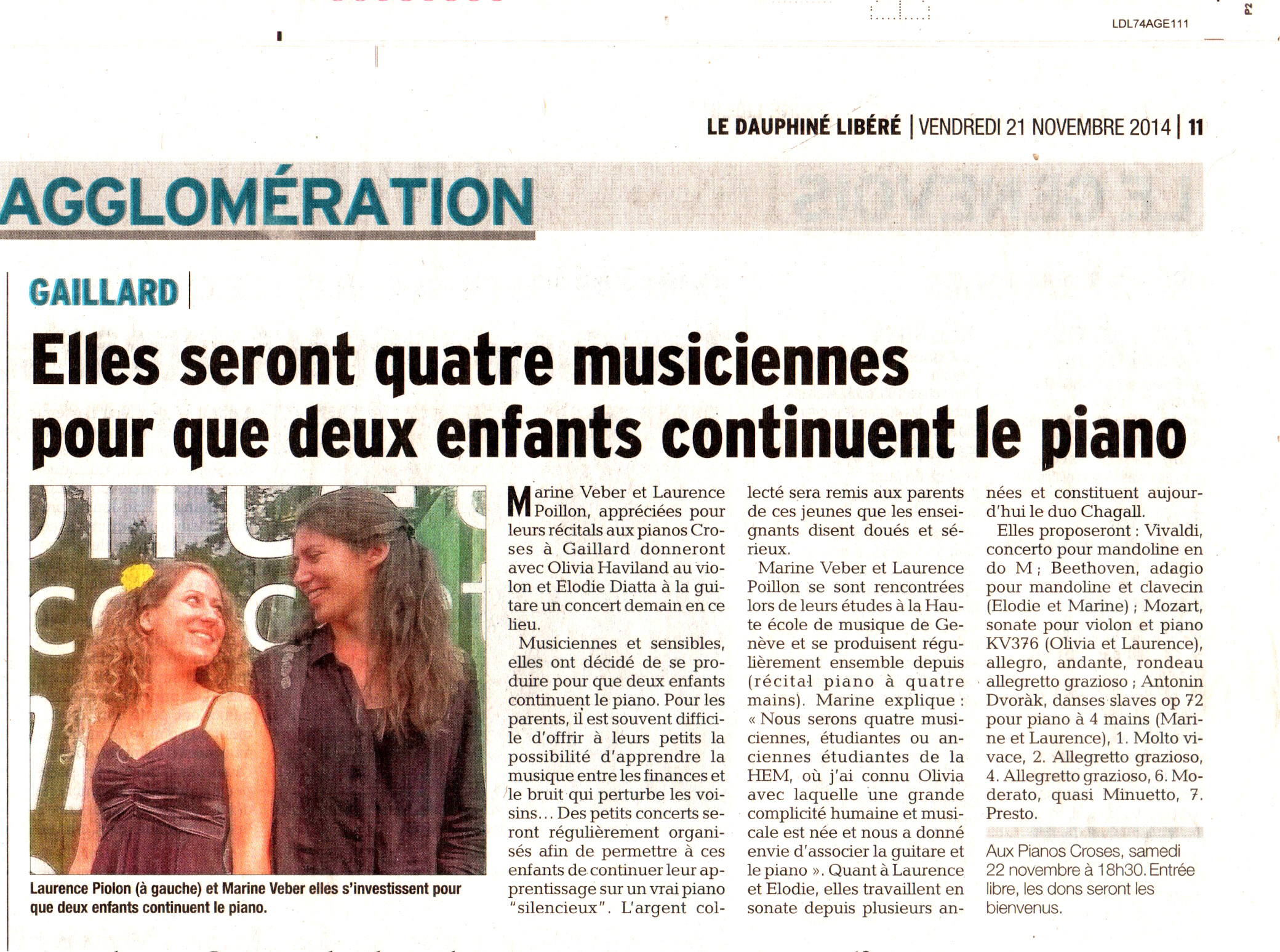 Article du "Dauphiné Libéré", novembre 2014 : "Elles seront 4 musiciennes pour que 2 enfants continuent le piano".