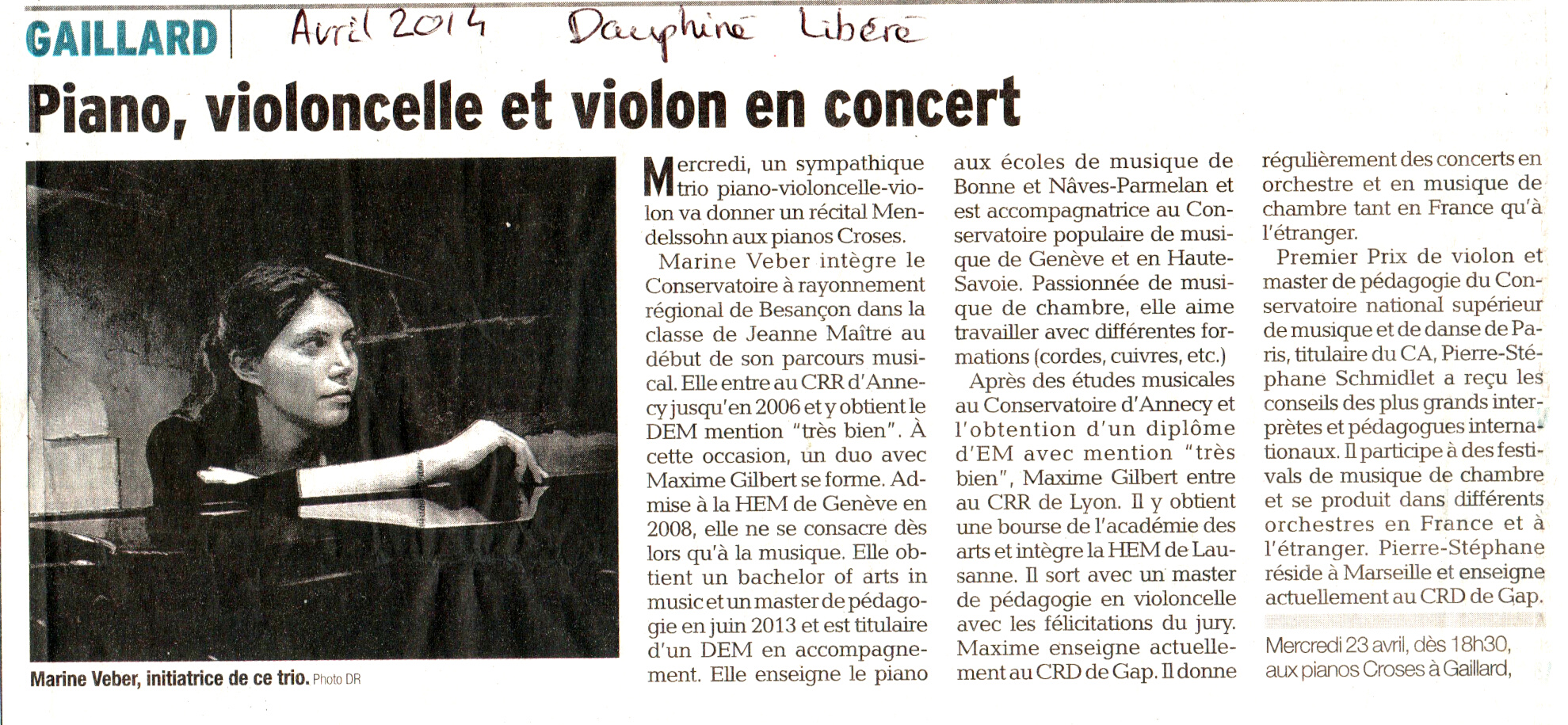 Article du "Dauphiné Libéré", avril 2014 : "Piano; violoncelle et violon en concert"