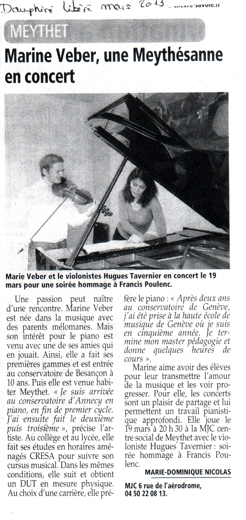 Article du "Dauphine Libéré", mars 2013 : "Marine Veber, une Meythésanne en concert"